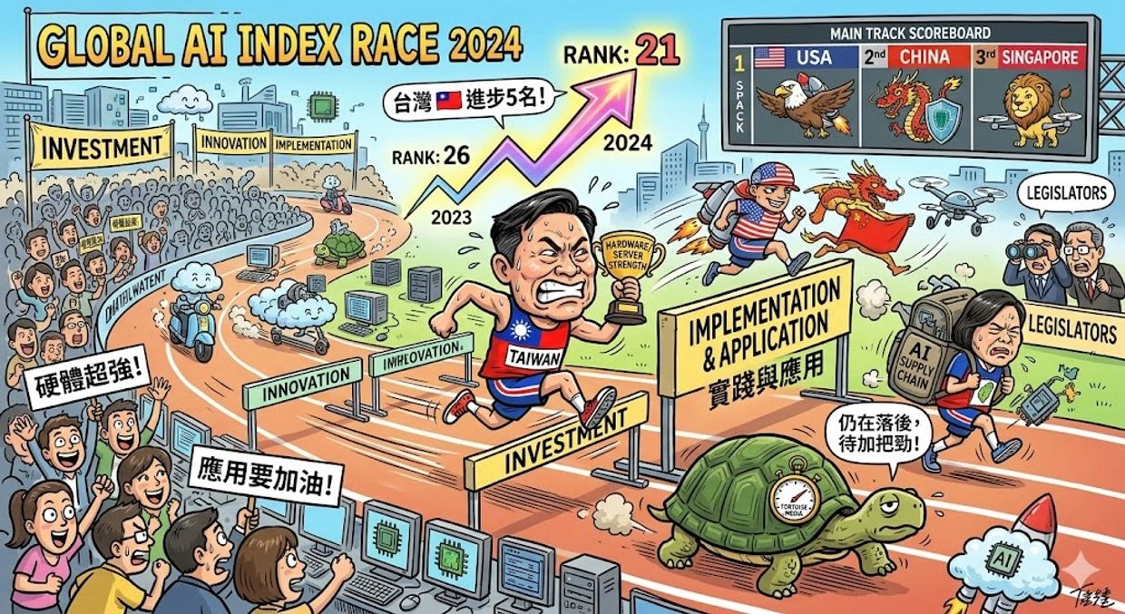 Tortoise Media以「投資」、「創新」與「實踐」三大指標評估各國AI實力。台灣此次排名提升,反映出在技術研發與產業投入方面持續累積能量。